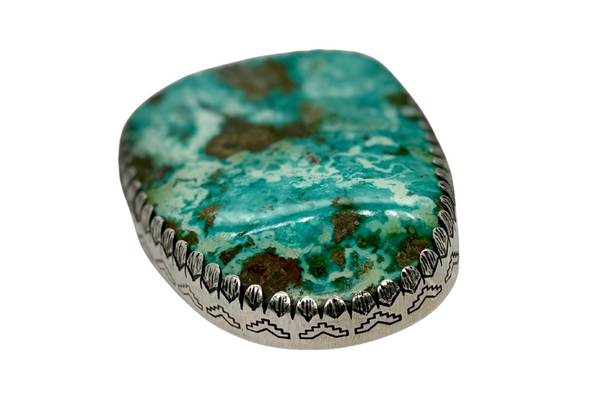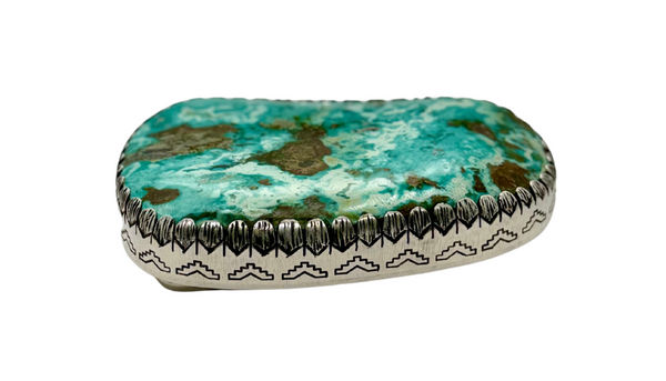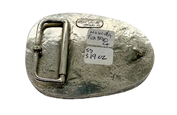 Hand carved handmade sterling silver buckle setting with 590 ct Nevada Fox turquoise. This exquisite buckle is one of a kind.