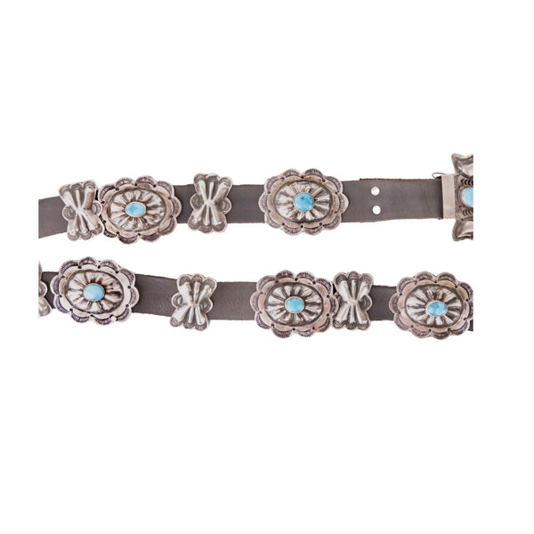 Hand cut real leather belt with 17 handmade sterling silver conchos and blue ridge turquoise.