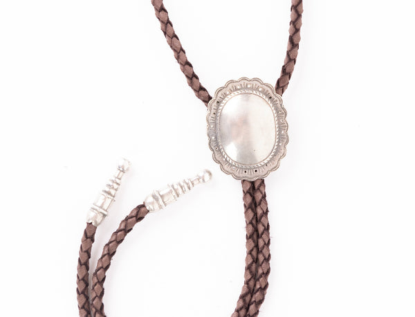 Hand cut braided leather bolo with handmade sterling silver concho and tips.