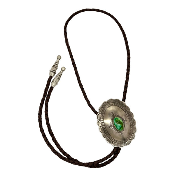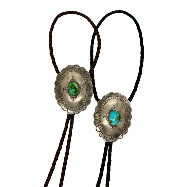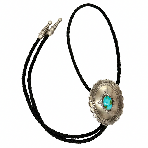 Handmade sterling silver scallop concho with Blue Ridge Turquoise stone in center. Bolo is made out of real leather and hand braided. Ends include handmade sterling silver end caps.