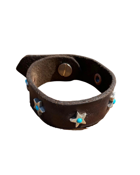 Re-purposed leather bracelet with sterling silver stars with set turquoise stones and sterling silver buckle and rivet clasp