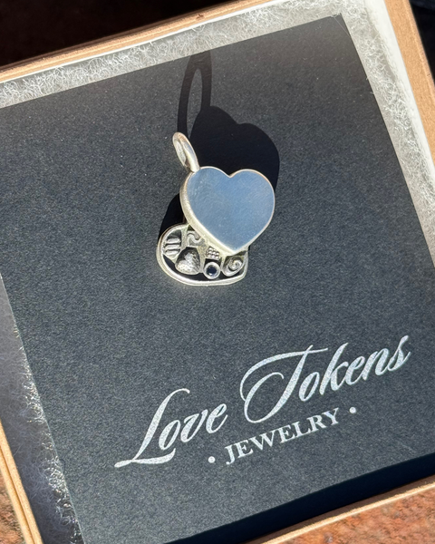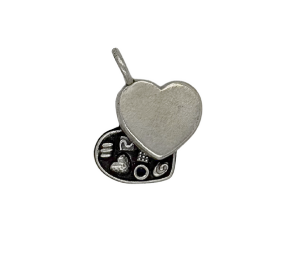 Handmade sterling silver heart box of chocolates charm with one black diamond inside.