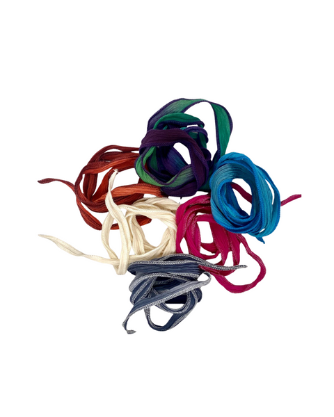 Our silk wraps can be worn as a wrap bracelet or a necklace. Perfect to wear alone or stack up with your charms! The color light Turquoise is photographed on the model wrist.
