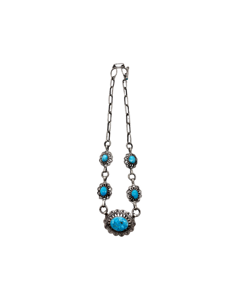 Beautiful blue turquoise set into 5 handcrafted sterling silver conchos.