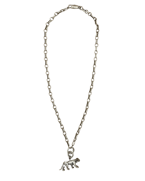Materials: Sterling silver round and oval chain with a bronze tiger