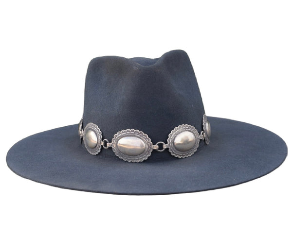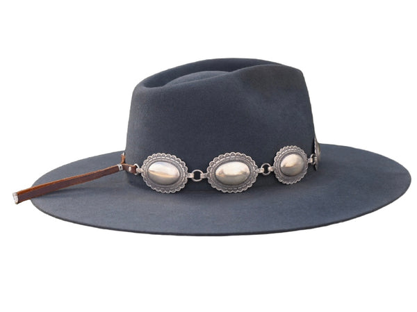 Eight handmade sterling silver conchos held together with handmade silver concho rings. There's a hand cut leather cinch at back.