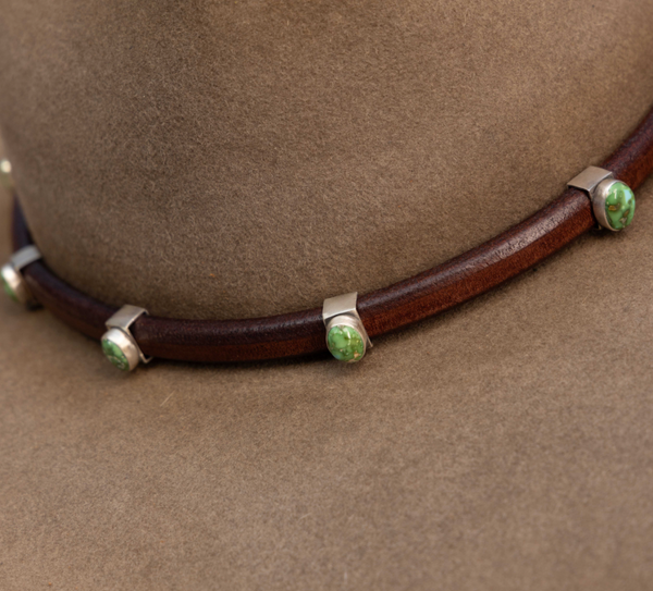 Hand cut leather hat band with handmade sterling silver slides that include pieces of Sonoran gold turquoise.