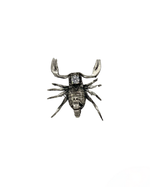 Handmade sterling silver or bronze scorpion hat pin with one CZ.