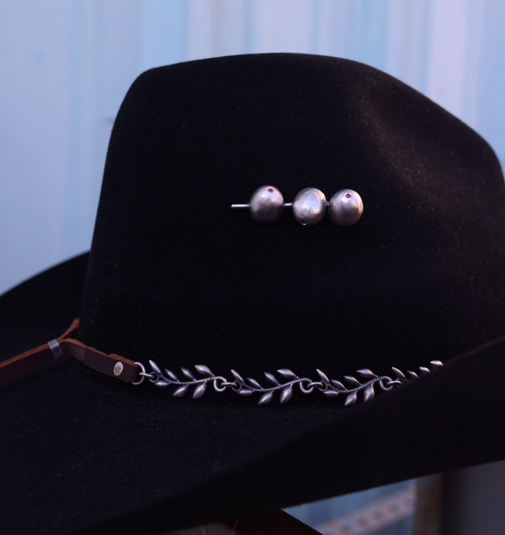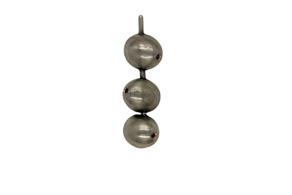 Handmade sterling silver or bronze three martini olives with garnets in each olive. The pin is about 2" long.