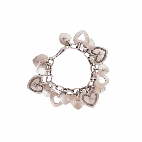 Handmade sterling silver bracelet with various hearts. The bracelet contains eight 2.5 mm natural diamonds.