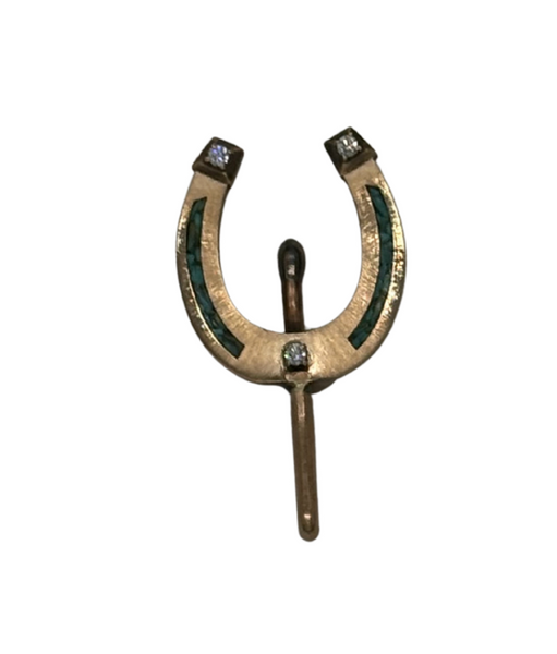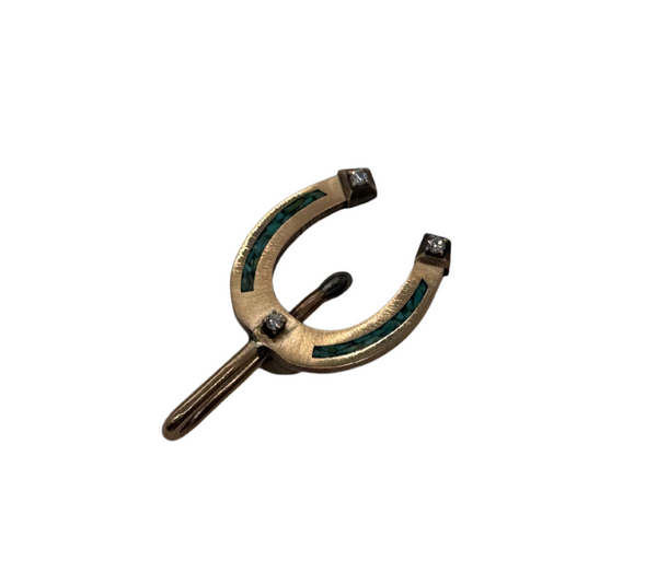 Handmade sterling silver hat token with “Lucky Me” engraved on back. The horseshoe includes Kingman inlay turquoise and three 2.5 mm natural diamonds.