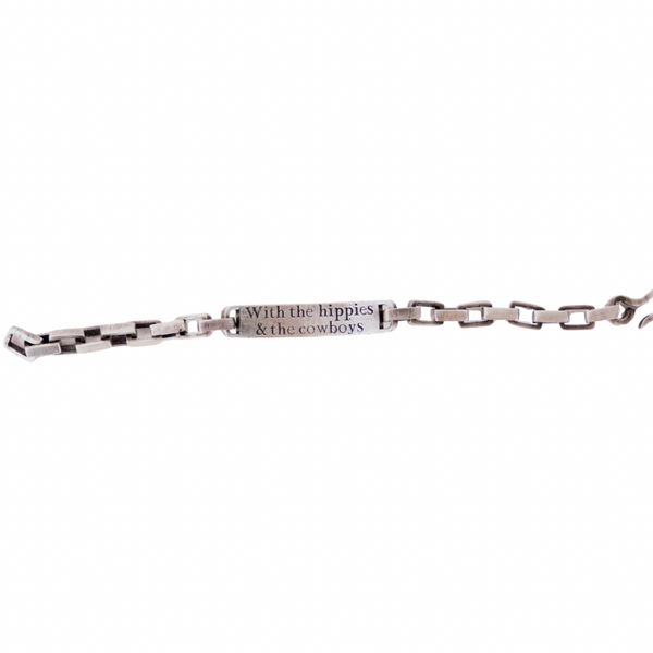 Handmade sterling silver “Raisin’ Hell” Bracelet. Add two 2.5mm natural diamonds or none at all. Back is engraved with the saying “with the hippies and the cowboys”.