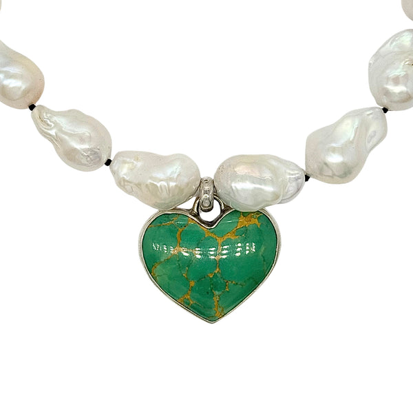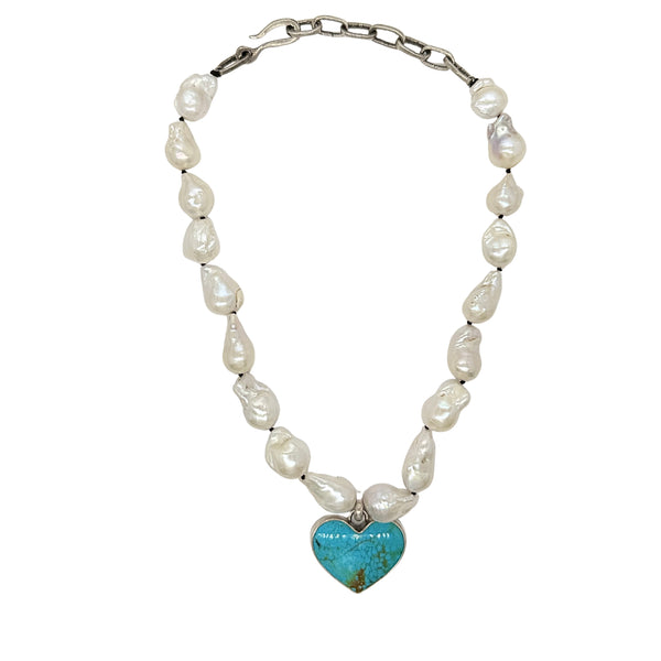Hand knotted baroque pearls on handmade sterling silver extender chain with a 40ct Kingman heart.