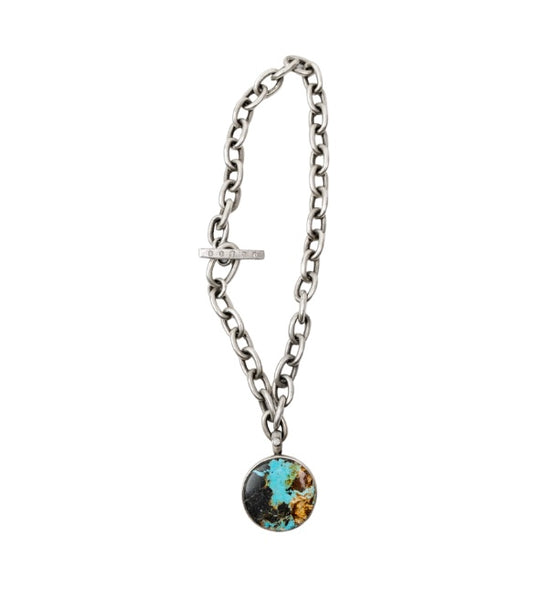 Handmade sterling silver chain with four 2mm natural diamonds and one 2.5mm natural diamond at toggle. The stone is 60 carat Blue Moon Turquoise with a 2.5mm natural diamond at bail. 16” chain. One of a kind stone.