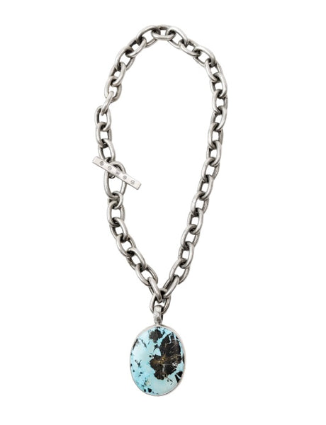 Handmade sterling silver chain with four 2mm natural diamonds and one 2.5mm natural diamond at toggle. The stone is 70 carat Blue Moon Turquoise with a 2.5mm natural diamond at bail. 16” chain. One of a kind stone.