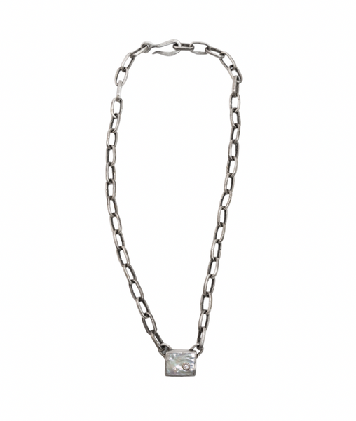 Handmade sterling silver melody chain with a baroque pearl and one 2.5mm natural diamond drilled in.