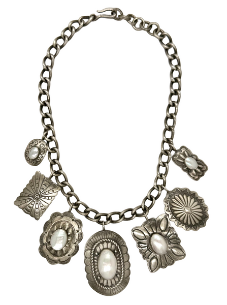 Handmade sterling silver Isabel chain necklace with seven hadmade conchos that vary in design. Each concno contains one high grade oval pearl cab. Necklace is made to be 20" long but you can select different lengths if needed.