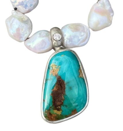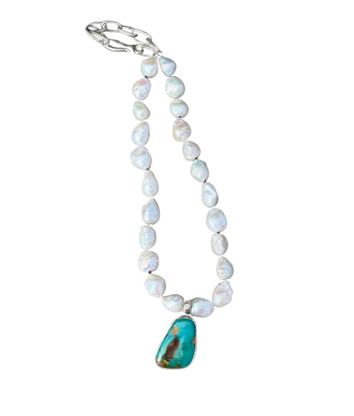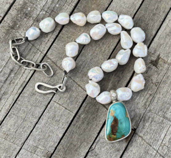 Hand-knotted high grade baroque pearl necklace with a handmade sterling silver Melissa chain, 40 carat Royston stone, and a 2.5mm diamond on the bail.