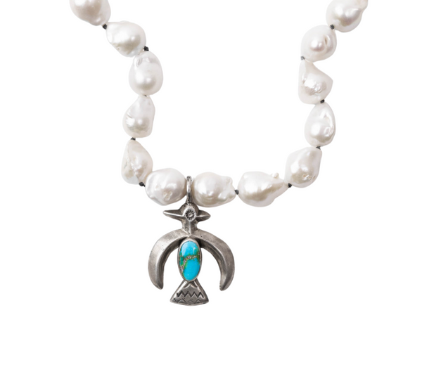 Hand knotted white baroque pearls with handmade sterling silver melody chain. Necklace includes handmade sterling silver thunderbird naja with Kingman turquoise.