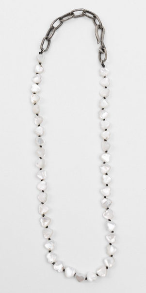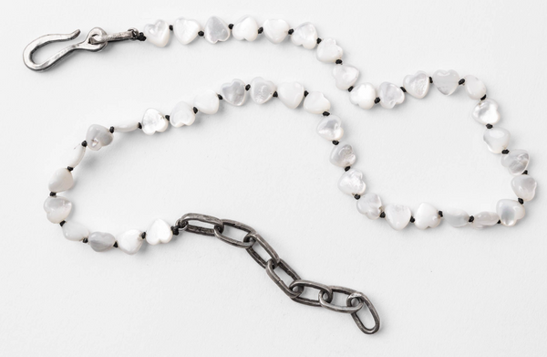 Knotted mother of pearl hearts with handmade sterling silver adjustable melody chain.