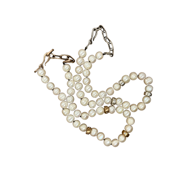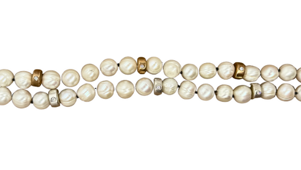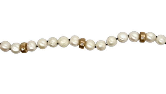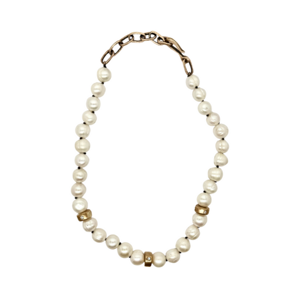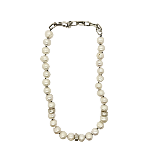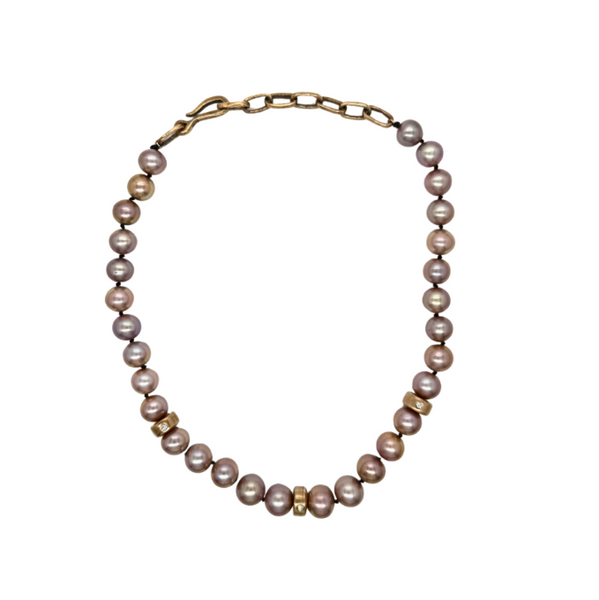 Natural potato pearl necklace with three handmade beads that have three 2.5mm diamonds. Melody chain extender at back of necklace. Available in sterling silver or bronze.