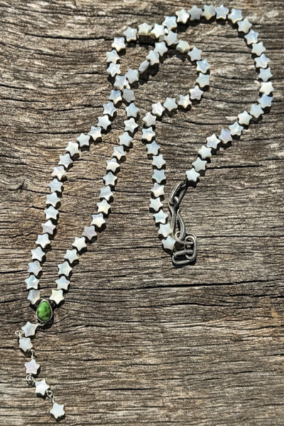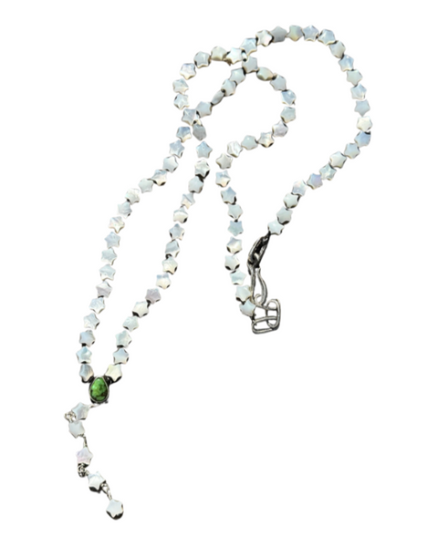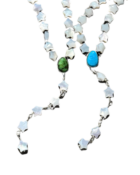 White Mother of Pearl Star hand knotted rosary with a 3.5 carat bluebird turquoise set in sterling silver as centerpiece.
