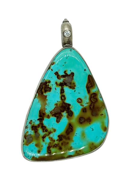 Handmade sterling silver pendant casing 80ct Royston turquoise. The pendant has one 2.5mm natural diamond at the bail. This pendant has out removable "Everlink" clasp. We have created an adjustable clasp that you can add or remove to any necklace.