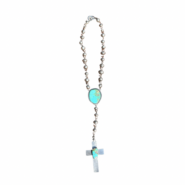 Handmade sterling silver bead necklace with 115ct Royston cab at the center and a 35ct Royston cab on the sterling silver cross. Total length is 29"