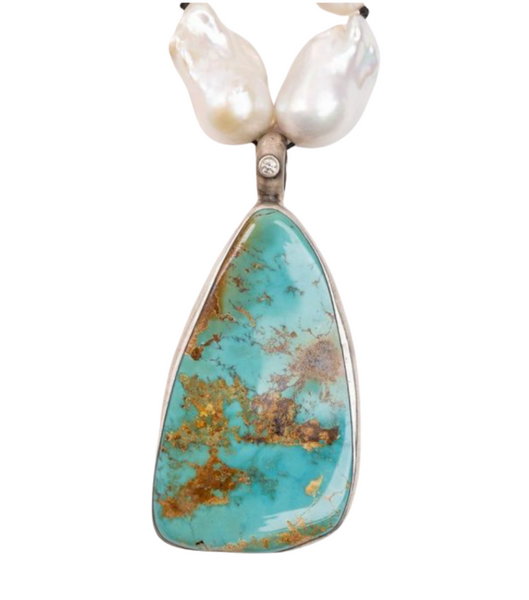 Hand knotted baroque pearls with handmade sterling silver elody chain at back. Necklace includes 45 carat royston turquoise with a 2.5mm natural diamond at bale. Entire necklace is 28" and lays 14" long.