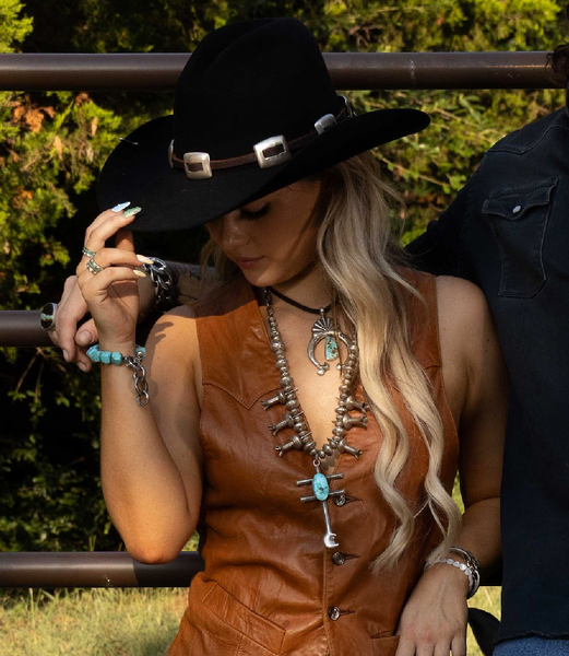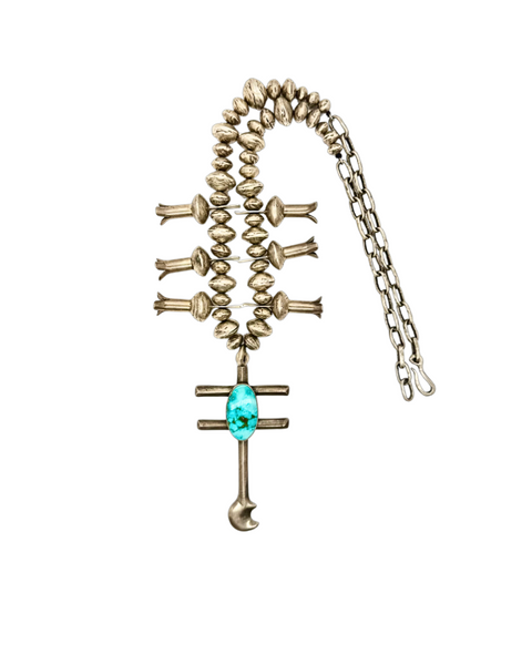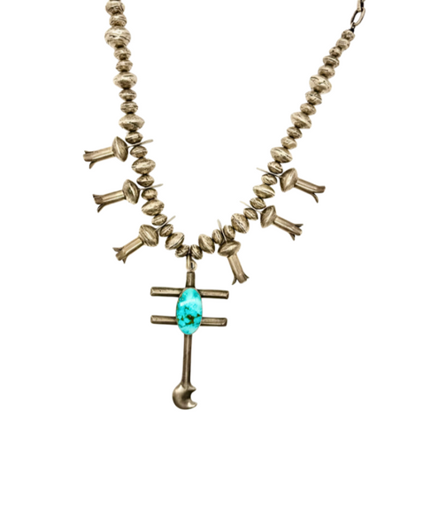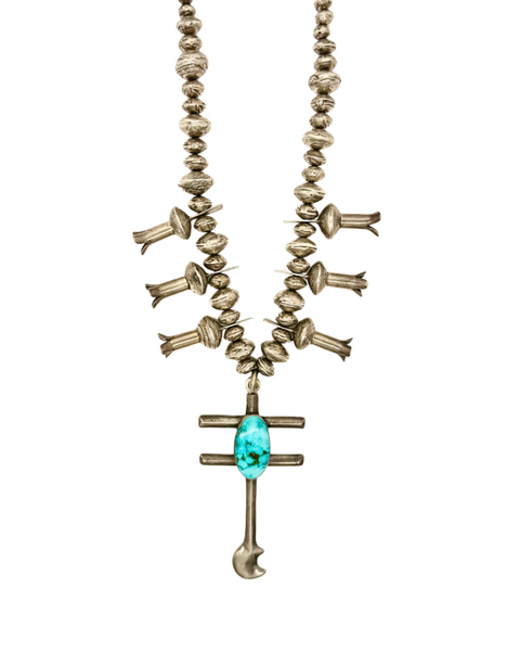 6 silver squash blossoms, sterling silver beads, sterling silver Dragonfly Cross pendant with Royston turquoise set in the center, and the Melody chain to clasp at the back. All handmade and put together to assemble the most perfect necklace.