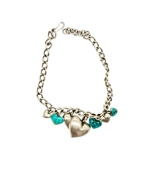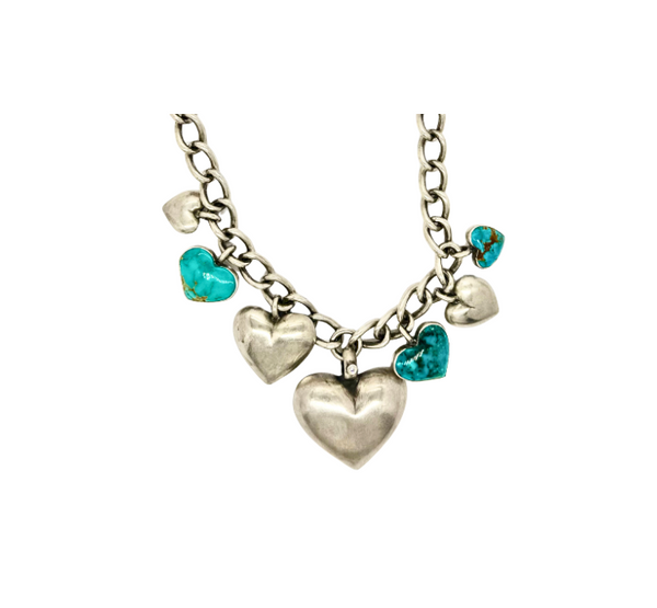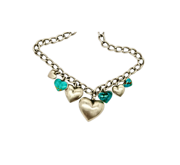 Three Kingman Turquoise Hearts, three sterling silver bubble heart charms, and one diamond bale sterling silver bubble heart with a 2.5mm diamond - All put together with our handmade sterling silver Isabel chain.