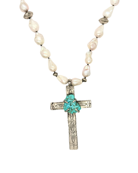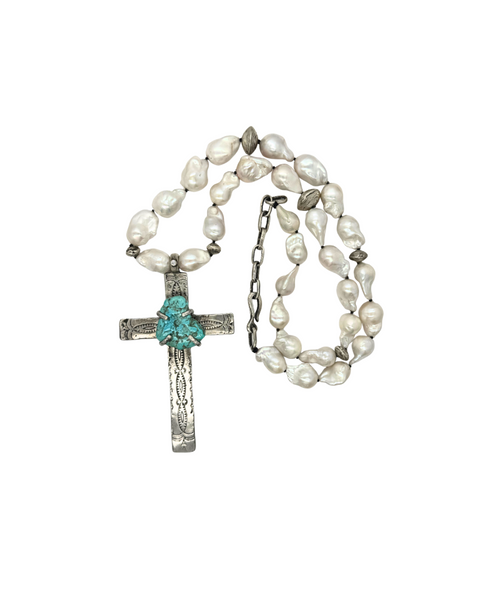 Sterling silver bead necklace with high grade baroque pearls. Necklace includes handmade sterling silver melody chain at clasp. The handmade sterling silver cross is engraved with designs and includes a 25ct turquoise chunk. There is a 2.5mm diamond at the bail. Necklace lays 20" in length.