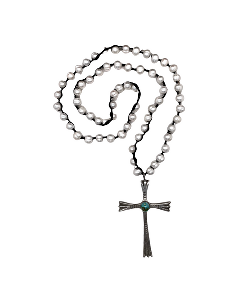 34" Freshwater Pearl Necklace with a sterling silver cross w/ bezel set turquoise