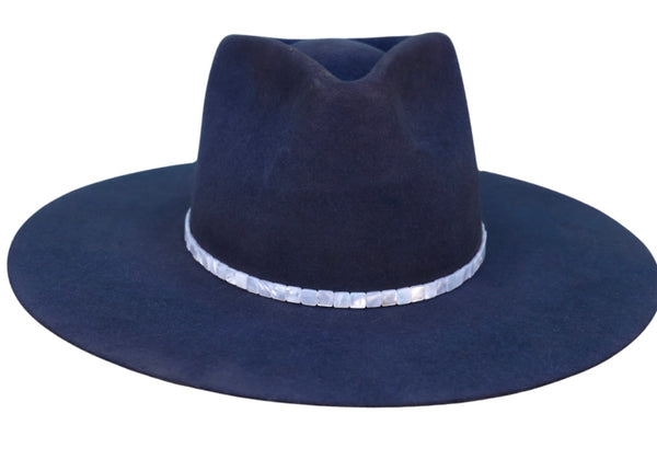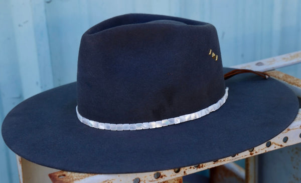Hand strung square mother of pearl hat band with adjustable leather cinch at closure.