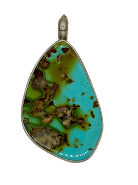 Handmade sterling silver pendant casing 75ct Royston turquoise. The pendant has one 2.5mm natural diamond at the bail. This pendant has out removable "Everlink" clasp. We have created an adjustable clasp that you can add or remove to any necklace.