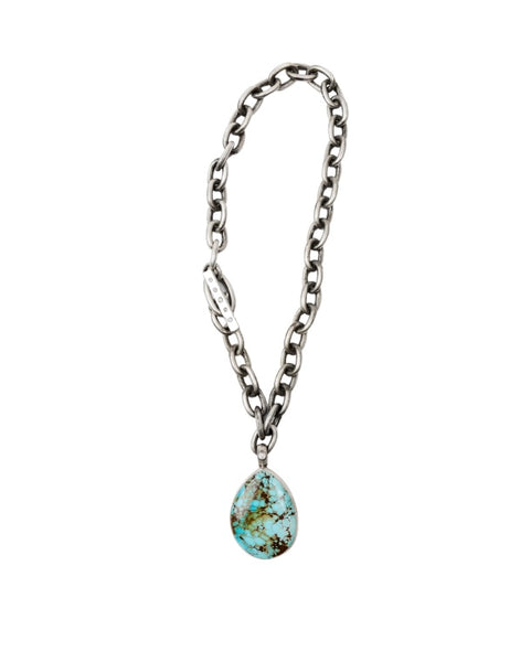 Handmade sterling silver chain with four 2mm natural diamonds and one 2.5mm natural diamond at toggle. The stone is 80 carat Blackjack Turquoise with a 2.5mm natural diamond at bail. 18” chain. One of a kind stone.